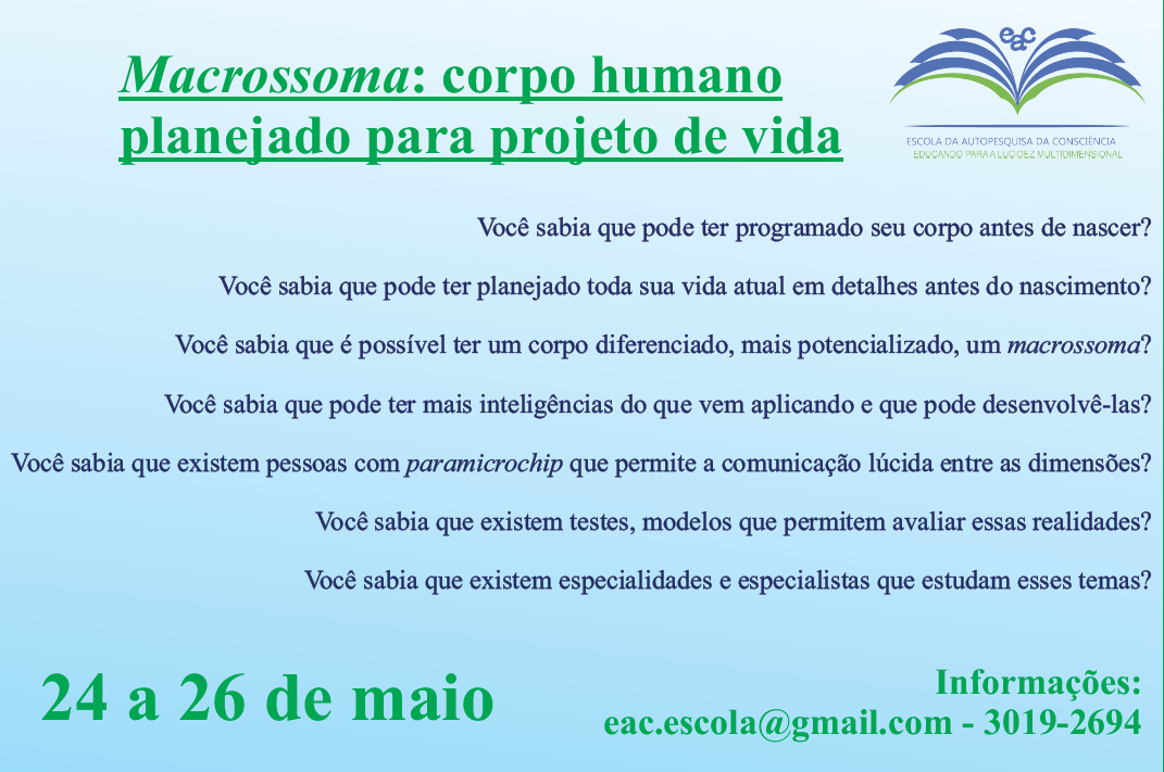 O curso Macrossoma: Corpo Humano Planejado será realizado de 24 a 26 de maio, na Escola da Autopesquisa da Consciência (rua Miguel Tostes, 275), em Porto Alegre. Com atividades teóricas e exercícios práticos, o objetivo principal é possibilitar que cada participante investigue se é portador de algum tipo de macrossoma, um corpo humano potencializado para a realização de determinada programação de vida.